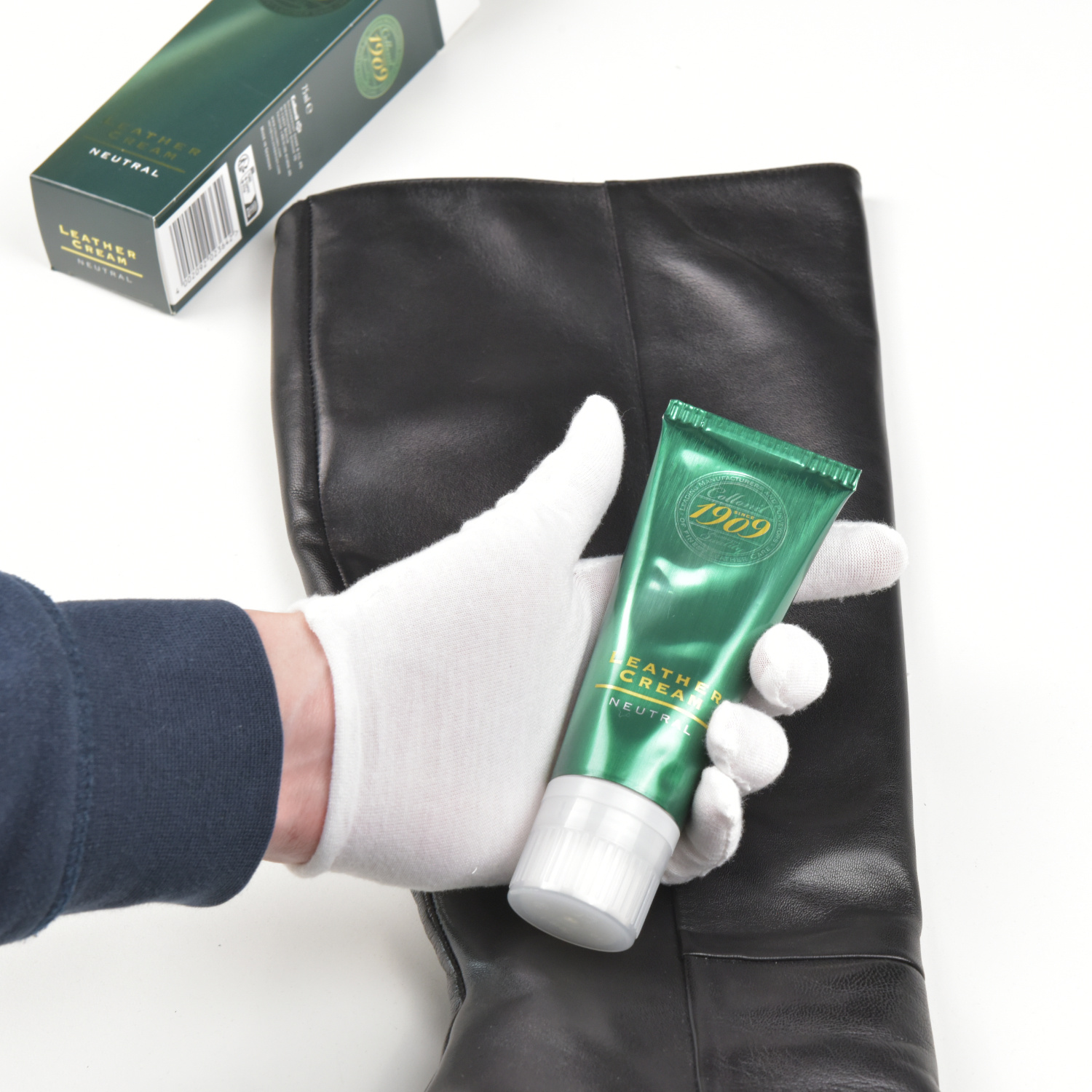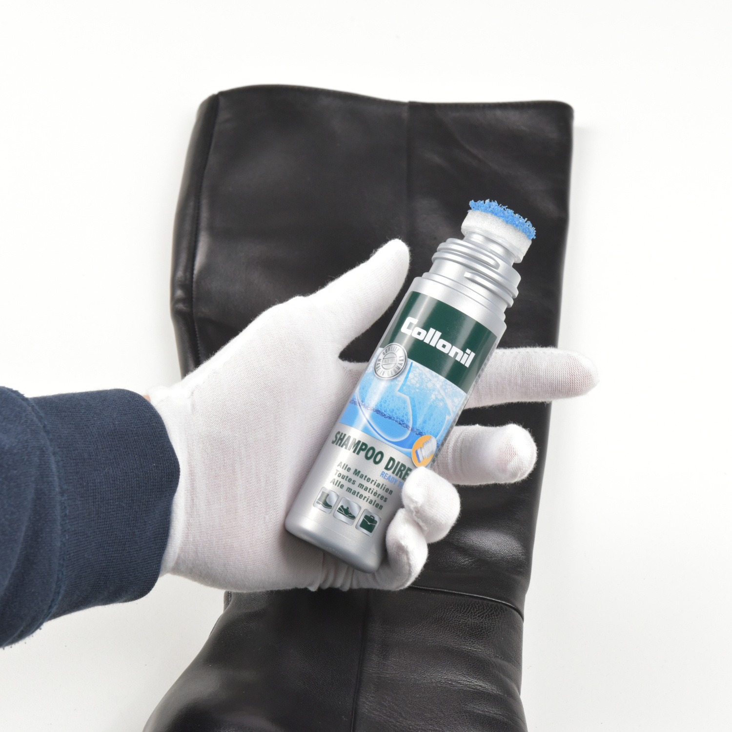 Clean your boots using the COLLONIL shampoo direct. Press the Shampoo Direct sponge to create foam, then work in light circular motions over the leather. When you have cleaned the entire surface area, wipe it down with the COLLONIL cloth.